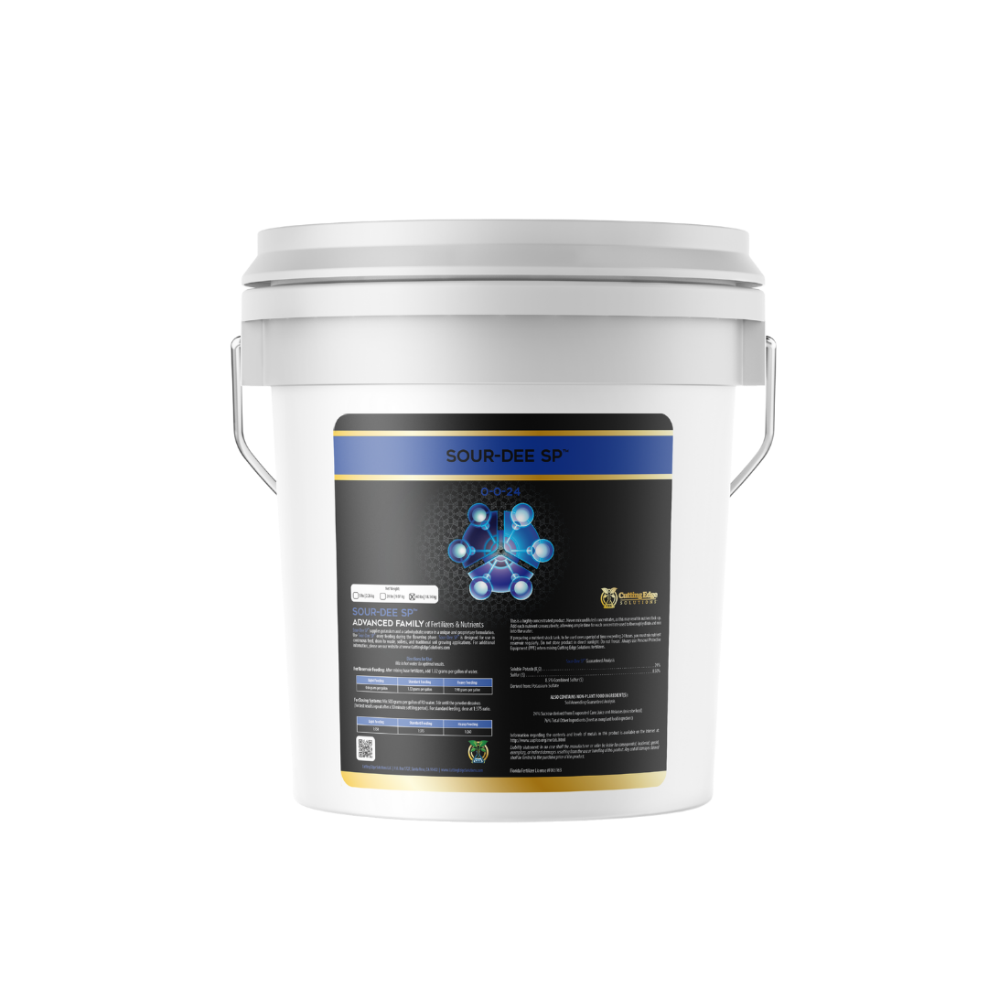 Sour-Dee SP™ 0-0-24 is a potassium- and sulfur-rich soluble powder that enhances floral development, supports beneficial microbes, and intensifies citrus, tropical, and fuel flavor profiles in hydroponic and soil systems.
